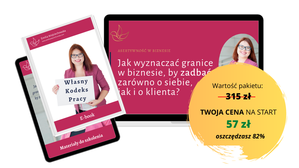 Ebook ten stanowi podsumowanie szkolenia, a także zawiera dodatkowe treści, które pozwolą Ci lepiej zrozumieć moje podejście do wyznaczania granic we własnym biznesie. Możesz też dzięki temu e-bookowi wrócić do ćwiczeń, które wykonamy na szkoleniu, a także popracować nad swoimi przekonaniami i wartościami, które pozwolą Ci stworzyć jeszcze lepszy Własny Kodeks Pracy.